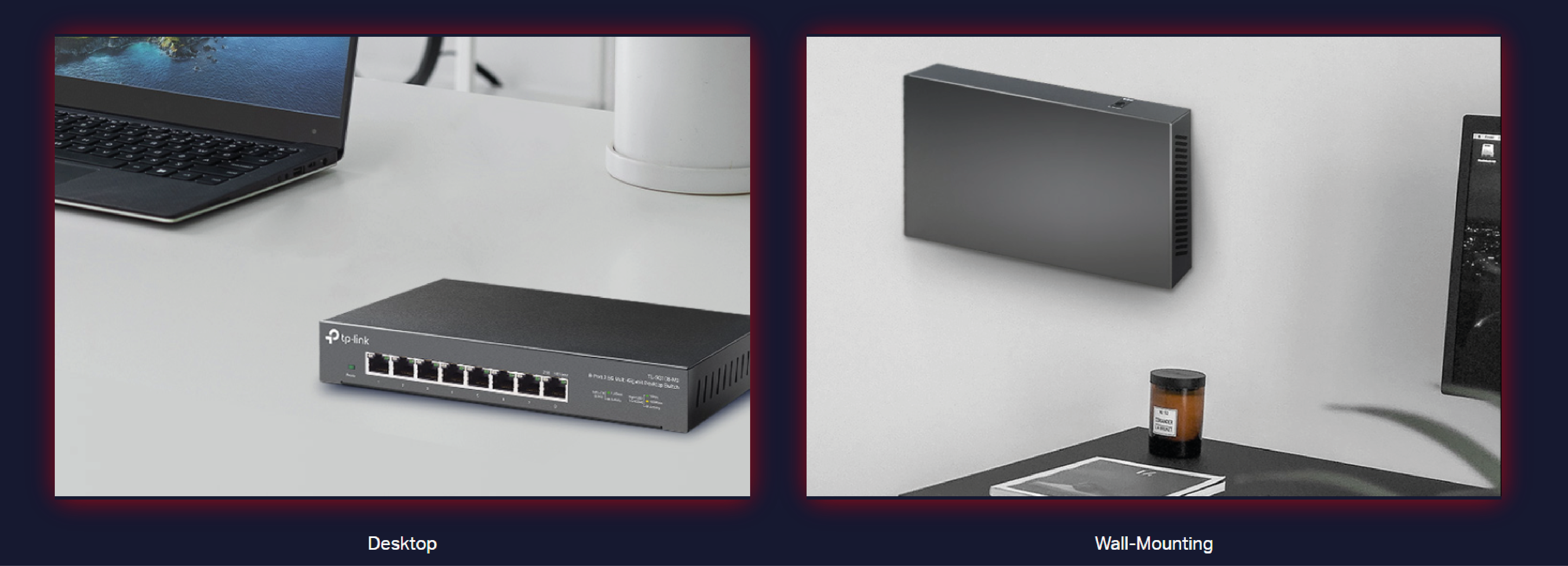 The device has no fans, so it operates very quietly and is thus a great addition to home or office network equipment. The durable metal casing, the option for desktop or wall mounting, and the very effective heat dissipation are features that make the TL-SG105-M2 a versatile device.