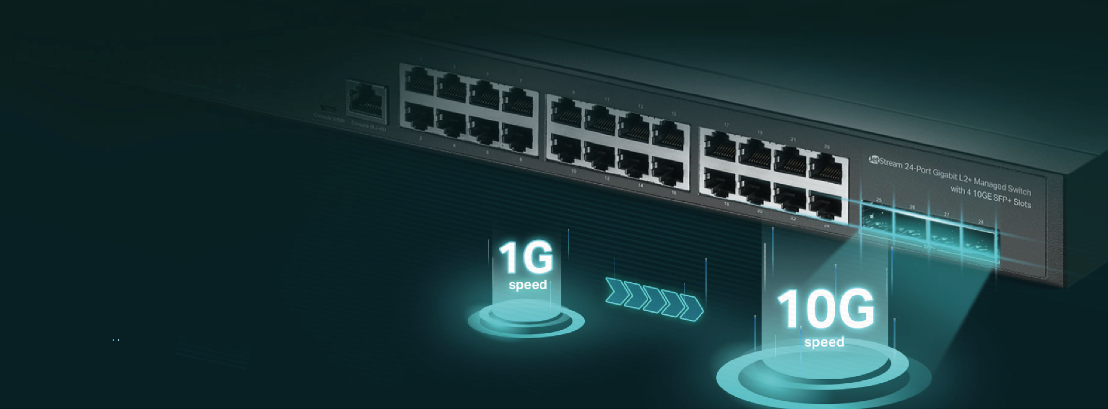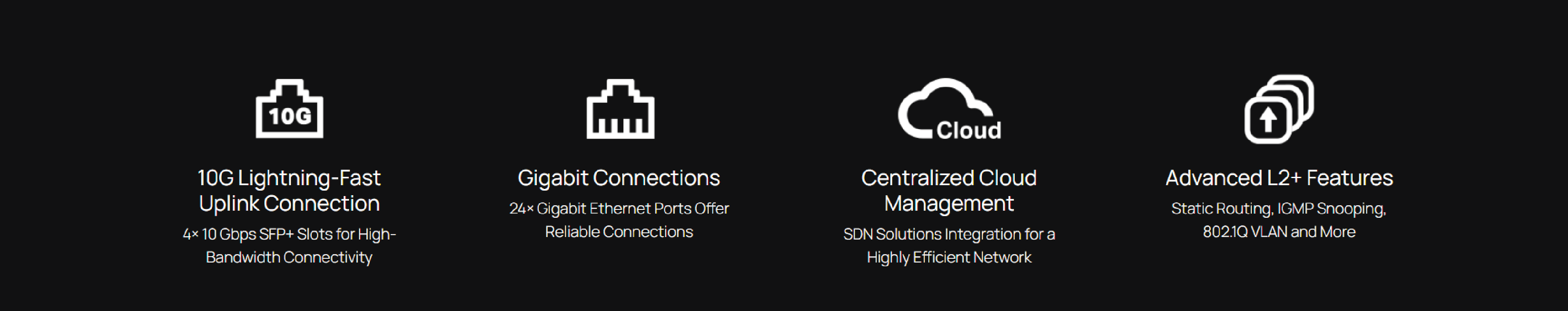 4× 10 Gbps SFP+ slots provide non-blocking switching performance and ultra-low latency, so reliable and lightning-fast connections to servers and other switches are easily built.