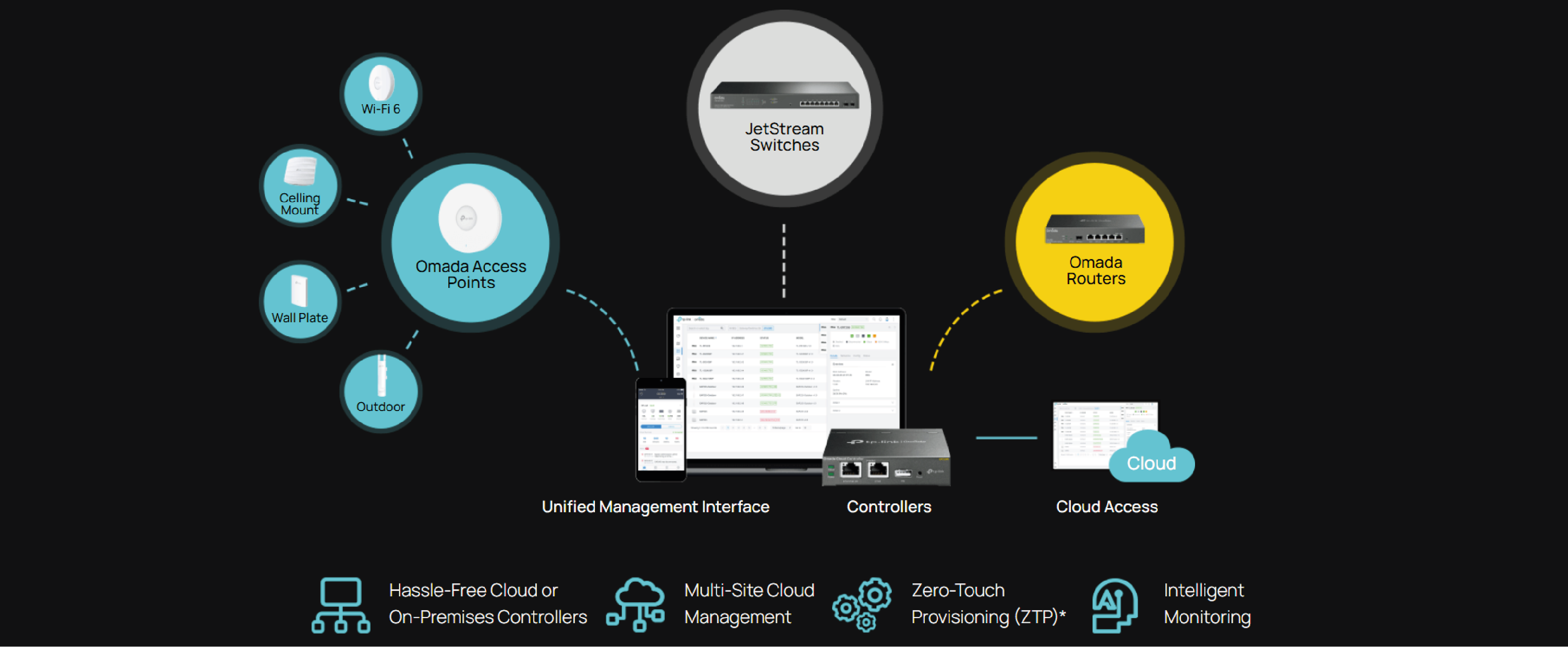 | Advanced Features | Support Omada Hardware Controller (OC200/OC300), Software Controller, Cloud-Based Controller Automatic Device Discovery Batch Configuration Batch Firmware Upgrading Intelligent Network Monitoring Abnormal Event Warnings Unified Configuration Reboot Schedule ZTP (Zero-Touch Provisioning) |